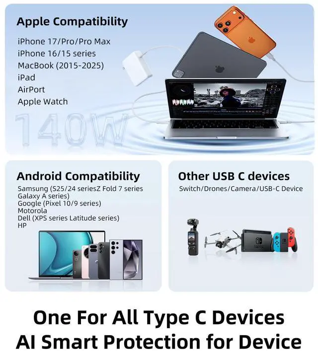 | Compatibility | Cellular Phones, Game Consoles, Laptops, MacBook Air 15 inch(M3, 2024), MacBook Air 15 inch(M2, 2023), MacBook Air 13 inch(M3, 2024), MacBook Air 13 inch(M2, 2022), MacBook Air 13 inch(M1, 2020), MacBook Air Retina 13 inch 2020, 2019,2018, MacBook Pro 16 inch(M3, 2023), MacBook Pro 16 inch(M2, 2022), MacBook Pro 16 inch(M1, 2021), MacBook pro 16 inch 2019, MacBook Pro 14 inch(M3, 2023), MacBook Pro 14 inch(M2, 2022), MacBook Pro 14 inch(M1, 2021), MacBook Pro 13 inch(M2, 2022),MacBook Pro 13 inch(M1, 2020), MacBook Pro 13 inch 2020,2019,2018,2017,2016, MacBook Pro 15 inch 2019,2018,2017,2016,Model A2780, A2452,A2141, A2442, A2338, A2251, A2159, A1989, A1706, A1708, A1990, A1707, IPad Pro 12.9 / 11 inch, iPad Air 5 / 4, iPad Mini 6, iPad 10, Surface Book 3 / 2 / 1, Surface Pro 8 7 6 5 4 3(Use USB C charging port), Dell, Lenovo, HP, iPhone 15, 15Pro, 15Plus, 15Pro Max, Samsung Chromebook, Any USB C device, macbook pro charger laptop charger mac book charger usb c charger mac book air charger mac charger mac book pro charger mac charger mac book pro mac air charger mac laptop charger mac pro charger mac charger usb c mac book computer charger mac book laptop charger mac computer charger |