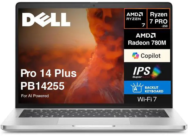 Model: Dell Pro 14 Plus PB14255Form/Style: StandardProcessor: Zen 4 Gen Ryzen 7 PRO 250 3.30GHz Processor (upto 5.1 GHz, 16MB Cache, 8-Cores, 16-Threads, )Memory: 16GB OnBoard LPDDR5X RAMGraphics: AMD Radeon 780M Integrated Graphics, Storage: 1TB PCIe SSD (Solid State Drive)Operating System: Windows 11 Pro-64Display: 14.0" IPS WUXGA (1920x1200) 60Hz 16:10 DisplayConnectivity: 802.11be, Bluetooth 5.4, RJ-45Ports/Slots:, HDMI, 2 Thunderbolt 4, Headphone/Microphone Combo JackInput/Output: Webcam, Grey, Backlit KB Standard Keyboard, Battery: 65W PSU, Type-C Power-In, 3-Cell 55 WHr BatteryOther Features, Color: Platinum SilverWeight: 3.3lbProduct Dimensions (WxLxH): 8.88 IN x 12.4 IN x 1 IN1 Year Manufacturer warranty from Velztorm (Professionally upgraded by Velztorm)