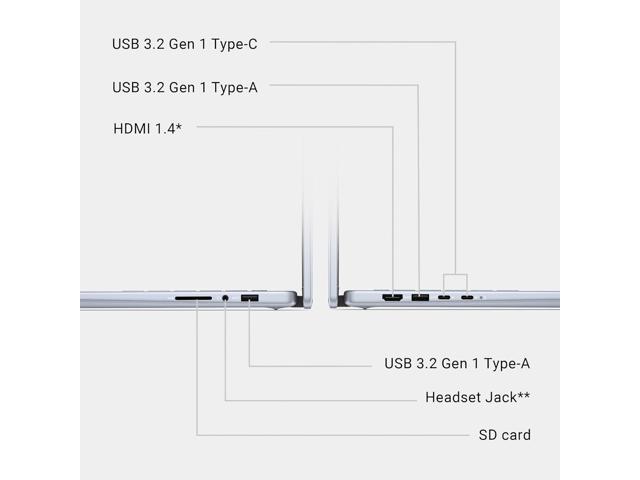 - Ports : 2 x USB-A 3.2, 2 x USB-C 3.2, 1 x HDMI 1.4, 1 x SD Card Slot