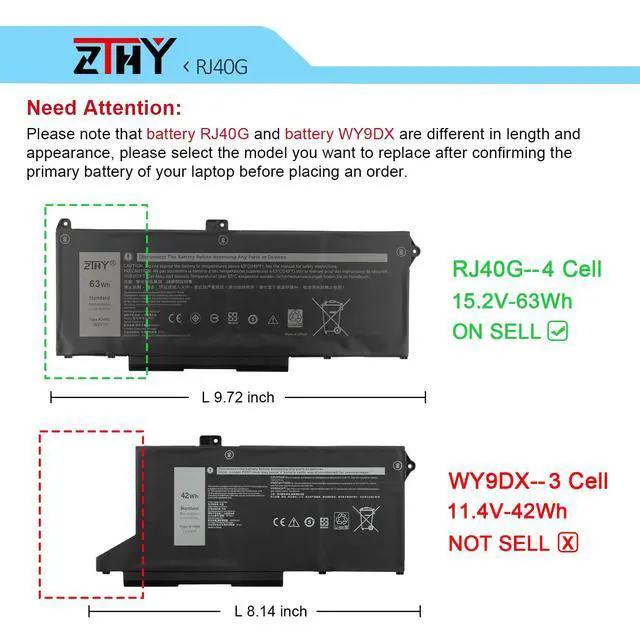 | Note | The Dell laptop models on this product page are compatible with 2 battery models: WY9DX (42Wh 3-Cell) , RJ40G(63Wh 4-Cell). Please open the back cover of your laptop to check the original battery size and capacity before placing an order. Please scroll down to the list to purchase. |