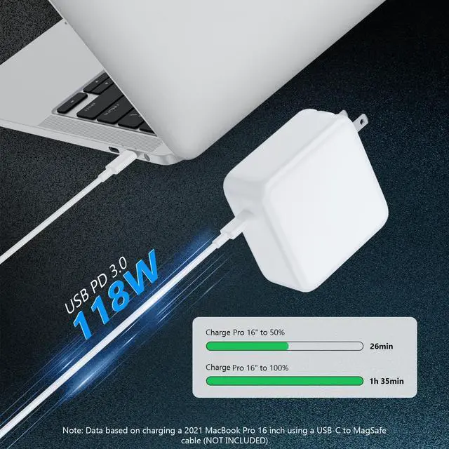 118W USB-C Universal Charger: The 118W USB C power adapter, using a USB-C to USB-C cable, provides the highest power for the 16-inch Mac Book Pro(2021) with a 50% charge in 27 minutes. Compatible with PD 20W 25W 29W 30W 61W 67W 87W 96W 100W models. 88% charge in 35 minutes