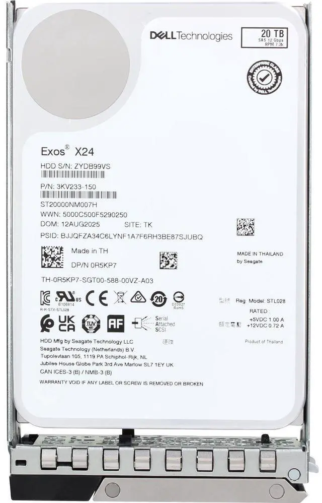 Up for sale is a Dell 20TB 7.2k 512e 12Gbps NL SAS 3.5 HDD Exos X24 (R5KP7-CDN). All components are tested and firmware is updated.