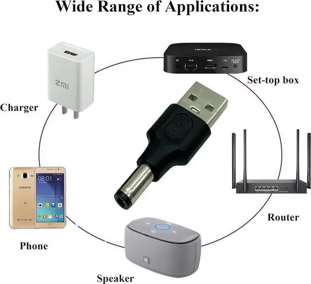 Compatible DC5.5×1.7mm DevicesUSB 2.0 A port can also charge DC devices,The DC 5.5 × 1.7mm port for small electronicsNight light, LED light bar, Small speaker,Toy car,Fan,Tablet computer,Massager,Wireless router,etc devices which Use a DC 5.5 × 1.7mm DC barrel jack for a power adapter.