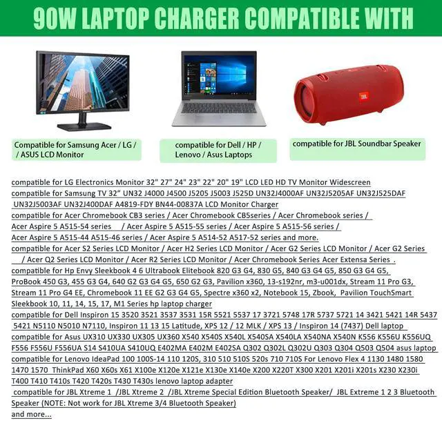 | Compatible with: | for 19Volt Gateway Toshiba Acer Laptop, JBL Speaker, Samsung LG LCD Monitor. | for LG Monitor, 19Volts DC Power Supply Adapter for LG Electronics Monitor 32" 27" 24" 23" 22" 20" 19" LCD LED HD TV Monitor Widescreen. | for Acer LCD SB220Q SA230 S231HL S232HL R240HY H236HL S202HL S230HL S240HL S220HQL S271HL S241HL G246HL G276HL AC Adapter. | for Asus Monitor 22'' 23'' 24'' 27'' VX238H VX238H-W VX228 VX228H VX248 VX248H Gaming Monitor MX279H VX239H VX279H MX239H LS246H 19V Power Supply Charger Cord. | for JBL Boombox 1 2, JBL Xtreme 1 2, Bluetooth Speaker, Replacement JBL Speaker AC Power Adapter. |