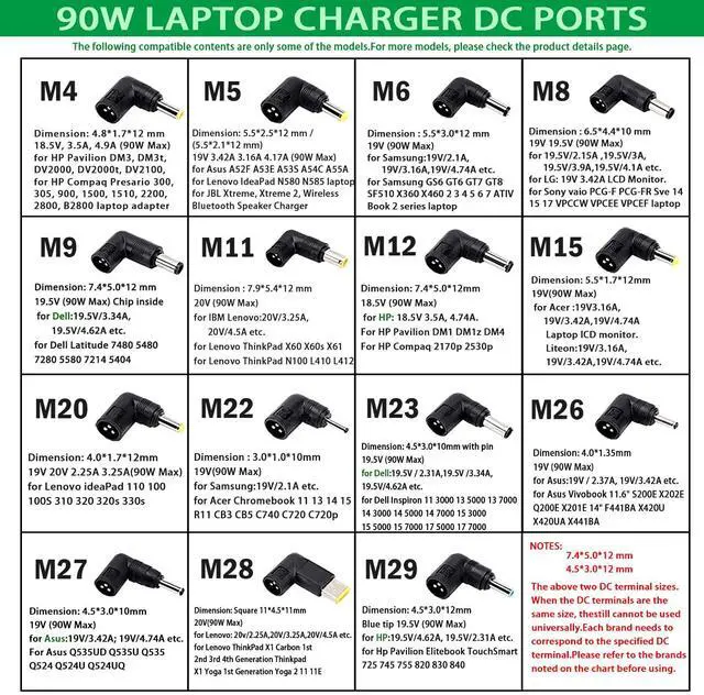 - M9: 7.4*5.0*12mm 19.5V 3.34A, 4.62A for Dell Inspiron XPS Vostro Latitude Portege Chromebook.