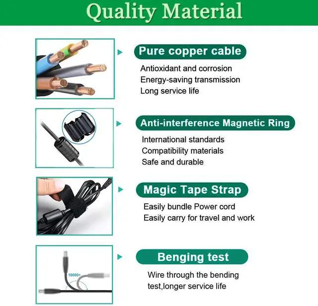 | DC Connector Size: | 4.8*1.7*12mm, 5.5*2.5 (2.1)*12mm, 5.5*3.0*12mm, 6.5*4.4*10mm, 7.4*5.0*12mm HP, 7.9*5.4*12mm, 7.4*5.0*12mm Dell, 5.5*1.7*12mm, 4.0*1.7*12mm, 3.0*1.0*10mm, 4.0*1.35*10mm, 4.5*3.0*10mm Dell, Square 11*4.5*11mm, 4.5*3.0*12mm ASUS , 4.5*3.0*12mm HP. |