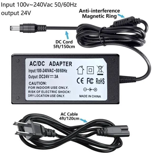 AC Input:100-240V 50/60Hz;DC Output:24V 3A(3000mA) 72W Note:The adapter only support voltage is 24V and the current less than 3A electronic devices.Before purchasing,please confirm whether your device is 24V for many kinds of small household electronics,like led strip lights,for 5050 3528 LED Strip, 3D Printer CCTV Security System, LCD Monitor (24V3A