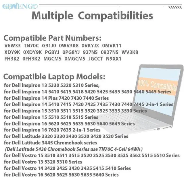 | Compatible Models | for Dell Inspiron 13 5330 5320 5310 Series, 14 5410 5415 5418 5420 5425 5435 5430 5440 5445 Series, 14 Plus 7420 7430 7440 Series, 14 5410 7415 7420 7425 7435 7430 7440 7445 2-in-1 Series, 15 3510 3511 3515 3520 3525 3535 3530 Series, 15 5510 Series | for Dell Inspiron 13 5330 5320 5310 Series, 14 5410 5415 5418 5420 5425 5435 5430 5440 5445 Series, 14 Plus 7420 7430 7440 Series, 14 5410 7415 7420 7425 7435 7430 7440 7445 2-in-1 Series |