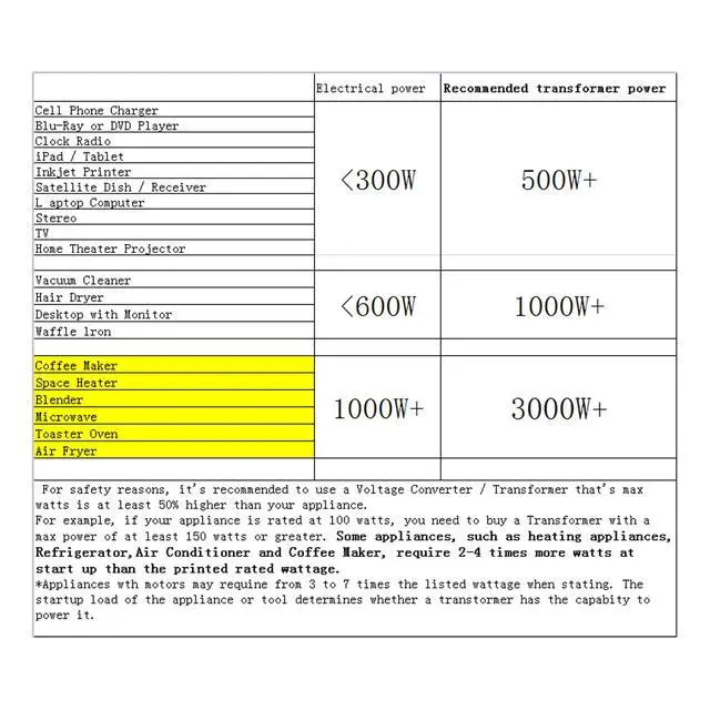 For example, if your appliance is rated at 100 watts, you need to buy a Transformer with a max power of at least 150 watts or greater. Some appliances, such as heating appliances, power tools, coffee maker, laser printers, dyson hair dryer,require 2-4 times more watts at start up than the printed rated wattage.