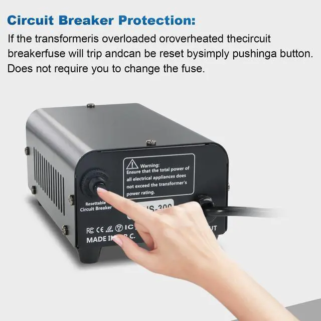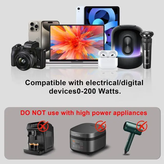 Check your appliance's power rating (label/manual): this transformer's max peak is 300W, so use devices under 200W—ideally, its power should be 50% higher than your appliance's to avoid overload.
