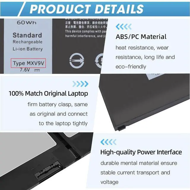 | Specifications: | Voltage: 7.6V; Capacity: 60Wh; Cells: 4-cell; The package also includes 1pcs MXV9V battery, 2pcs screwdrivers, and 1pcs instruction; Ships from US Warehouse; Full refunds are available for any reason within 60 days of purchase; If it becomes defective within one year of your purchase, we offer a free exchange |