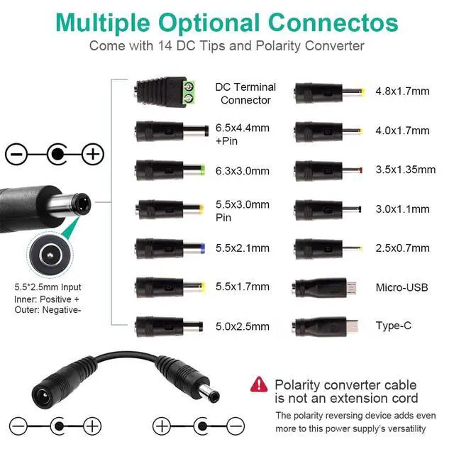 Package Includes: 1 x 3~24V 5A universal ac/dc adapter, 14 x DC tips, 1x reverse polarity converter. If you have any questions, please feel free to contact us via Amazon, and we are here for you