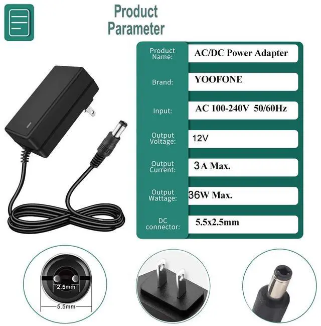 YOOFONE 12V DC 3A POWER SUPPLY