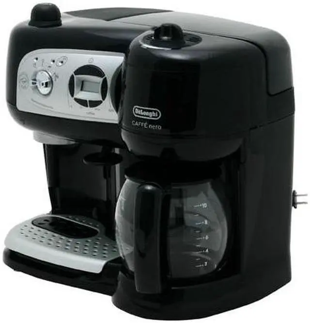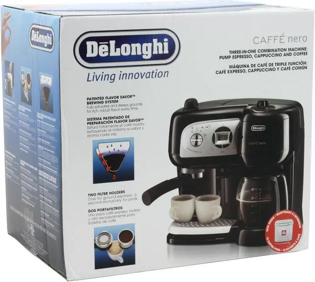 Delonghi Caffe nero Three in One combination Pump Easpresso, Cappuccino and Coffee Maker- Three in One machine prepares coffee, cappuccino and espresso. It can also make latte or hot chocolate perfectly. Dual Removable water tanks, easy to use controls, and anti-drop design.