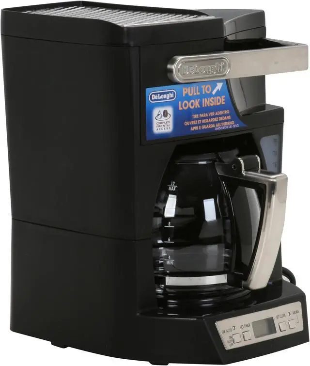Convenient Front AccessThe DeLonghi DCF212T provides complete front access, making it easy to fill the water tank and ground coffee filter without moving the unit – simply open the door using the handle, pour water in the channel and put grounds in the coffee filter.