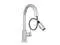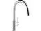 The faucet is operated with a sleek single handle. The spray wand is kept inside the spout thanks to the MagnaTite docking magnet. Simply pull down on the curved head to use the wand. If the spray holes get hard water build up, it can be wiped right off.