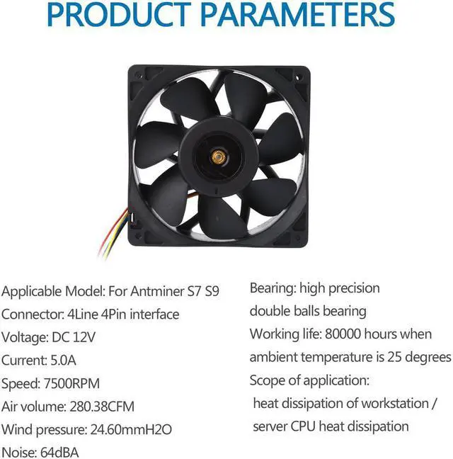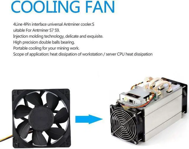 Features: 7500RPM high speed for fast cooling. 4Line 4Pin interface universal Antminer cooler. Suitable For Antminer S7 S9. Injection molding technology, delicate and exquisite. High precision double balls bearing. Portable cooling for your mining work.