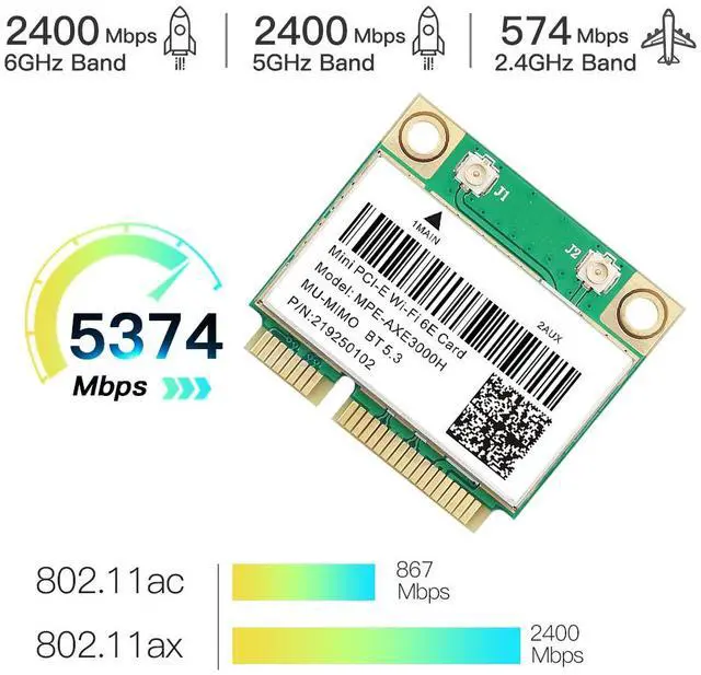 Enjoy lightning-fast wireless speeds with the AXE3000H network card, provides tri-band (2.4GHz, 5GHz and 6GHz) signal, max Speed up to 5400M: 574Mbps @2.4GHz + 2400Mbps @5GH +2400Mbps @6GHz, an ideal choice for WiFi upgrade your old laptop.