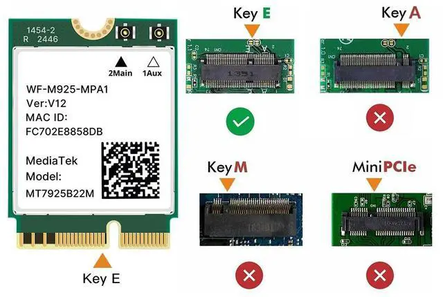Fits M.2 2230 A/E key (NGFF) slots. Supports Intel and AMD platforms. Compatible with Windows 11 (64-bit) and Linux Kernel 6.7+ with built-in drivers. Not for CNViO2 or Mini PCIe slots.