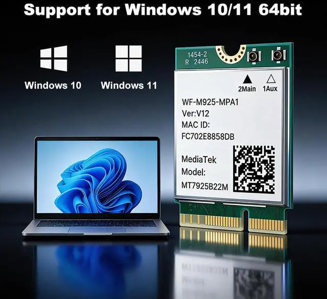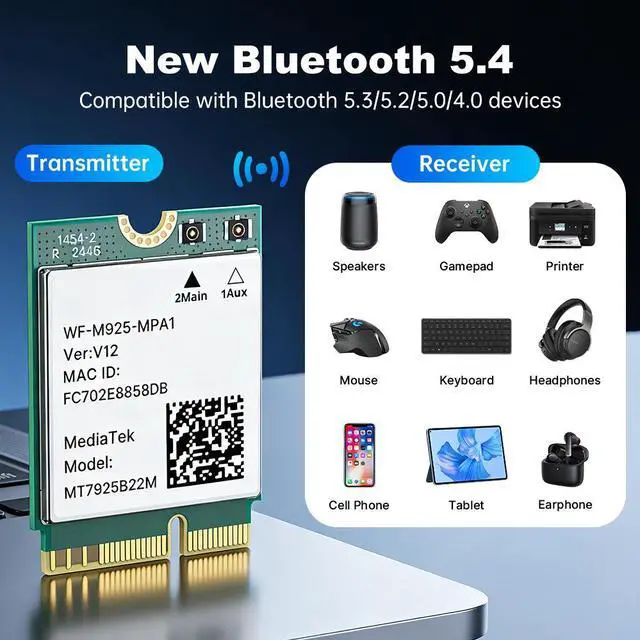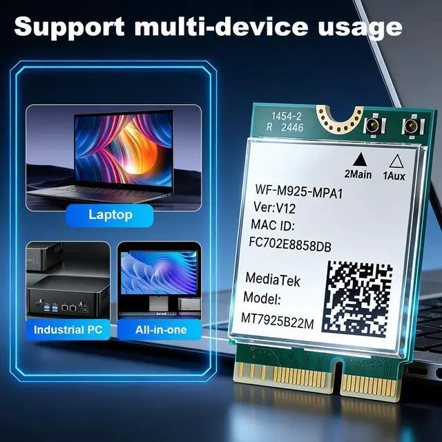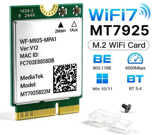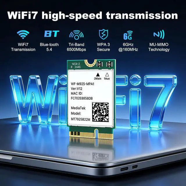 Upgrade your laptop PC with the BE6500 WiFi 7 M.2 Wireless Card, powered by the MT7925 chipset. This tri-band adapter supports 2.4GHz, 5GHz, and 6GHz with speeds up to 6.5Gbps, delivering ultra-low latency and high throughput for gaming, streaming, and video calls. Built-in Bluetooth 5.4 allows you to connect up to 7 devices simultaneously. With Multi-Link Operation (MLO) technology, broad compatibility, and advanced security, this M.2 2230 card is the future-proof solution for Windows and Linux laptops.