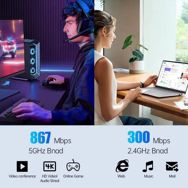 Lightning-Fast AC1200 WiFi Speeds: Up to 867 Mbps on 5GHz for lag-free gaming and 4K streaming, 300 Mbps on 2.4GHz for extended range.