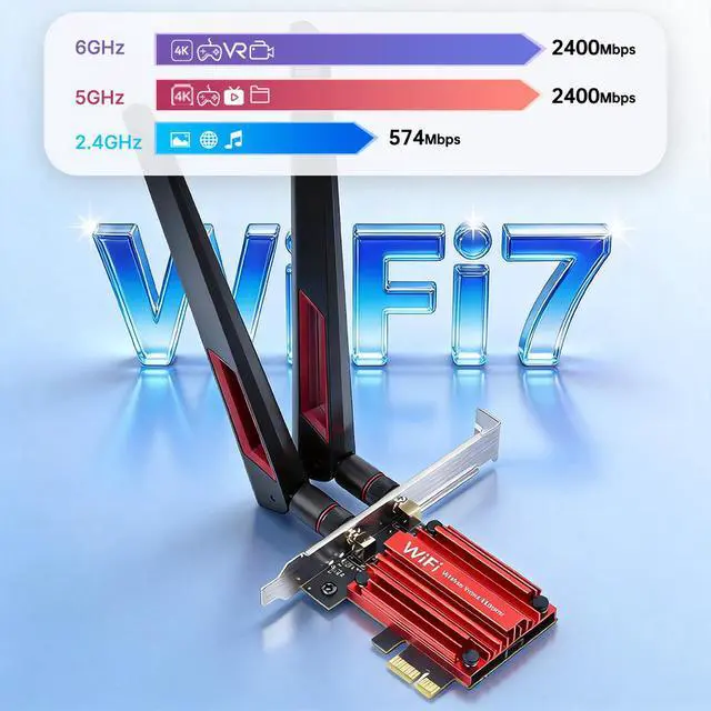 Upgrade your desktop PC to the next generation of wireless connectivity with the DERAPID Wi-Fi 7 PCIe Card. Powered by the MT7925 chipset, this tri-band adapter delivers blazing-fast speeds up to 6.5Gbps, ultra-low latency, and stable performance for gaming, 4K streaming, and video conferencing. With built-in Bluetooth 5.4 and Multi-Link Operation (MLO) technology, you get a seamless, future-proof wireless experience.