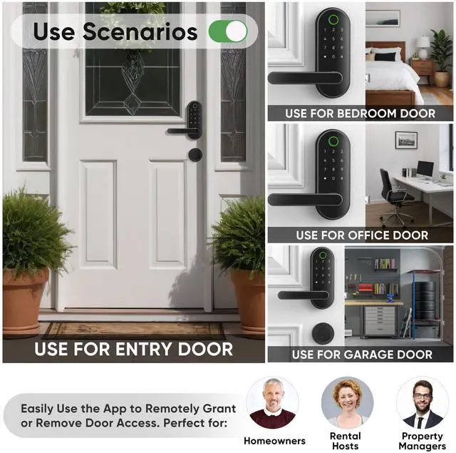[Use Scenarios] Suitable for entry doors, bedroom doors, garage doors, office doors, and more; easily use the smart app to remotely generate or remove codes for visitors or guests; perfect for homeowners, rental hosts, and property managers.