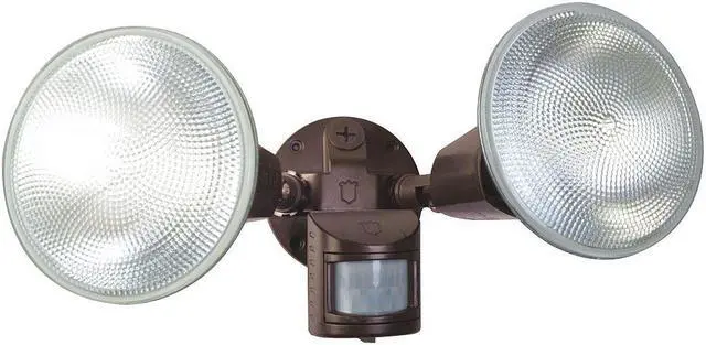 Adjustable Beam Security Light, Number of Lightheads 2, Fixture Wattage 240 W, Light Distribution Shape NEMA 5x5, Fixture Sensor Type Motion, Light Technology Incandescent, Color Temperature Not Applicable, Voltage 120V AC, Height 6 in, Width 5 in, Includes Lamp No Lamp Included, Lamp Watts 120 W, Fixture Housing Color Bronze, Fixture Housing Material Plastic, Mount Type Surface, Fixture Mounting Location Wall. This item has been restricted from sale in the following state (s): []