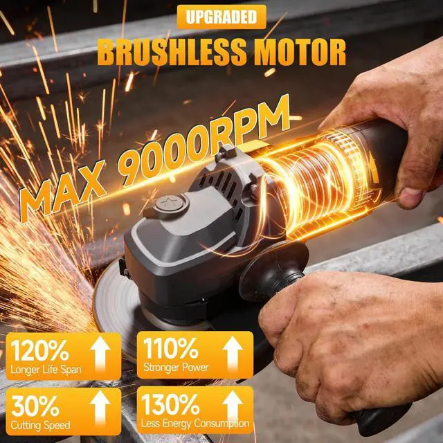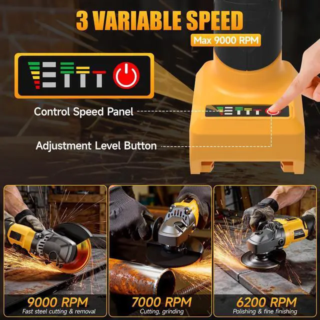 Powerful Brushless Motor & 3-Speed Control: This cordless grinder features an upgraded brushless motor delivering up to 9000 RPM, with 3 variable speed settings (62009000 RPM) adjusted via the power button. This grinder tool provides stronger performance, longer motor life, reduced power loss, and smoother, more controlled operation