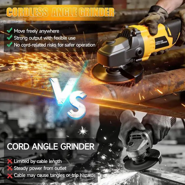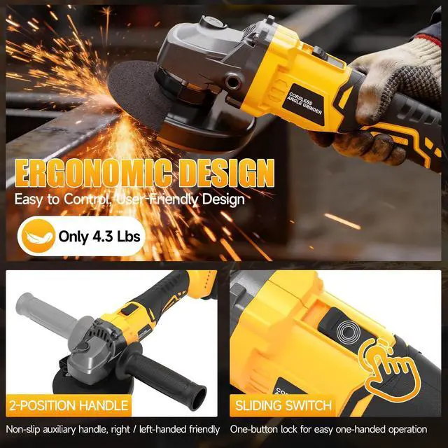 Upgraded Switch Design: This angle grinder cordless uses a slide switch designpush up to ON, pull down to OFFfor easy one-touch control. Built-in soft start protection helps prevent accidental startup after battery reinsertion, improving safety and control during daily grinder use