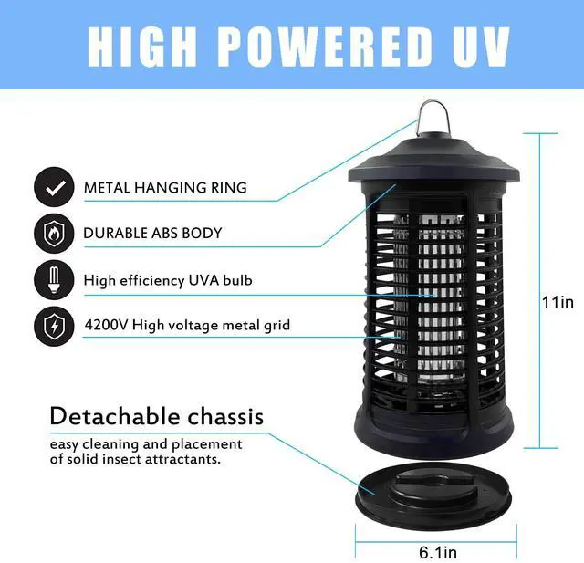 Ultraviolet (UV) light that insects can’t resist, Attract mosquitoes in with a 15w UV light (can also add bait attractant), Then 4200V current is released through the internal high voltage grid, which effectively kills the pests in a few seconds