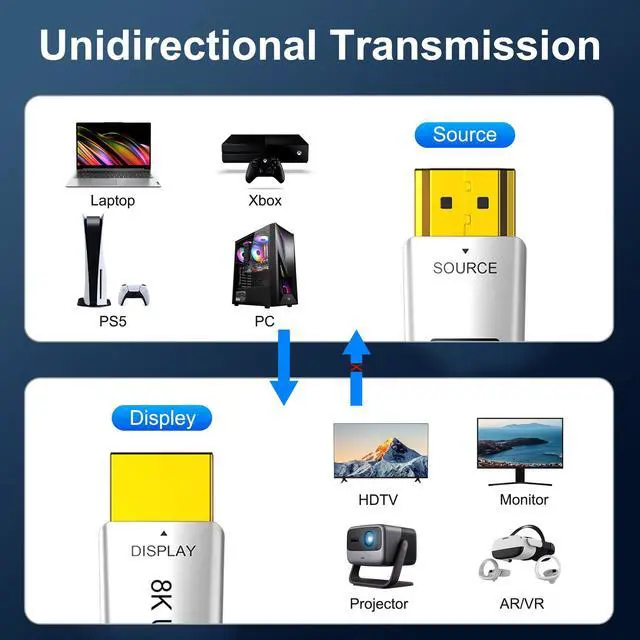 Fiber Optic HDMI Cable : The optical fiber hdmi cable is uni-directional transmission, the plugs at each end are marked "SOURCE" and "DISPLAY", please make sure you plug correctly, or you will not get signal from the device. The "SOURCE" plug is the signal source such as laptop, PC, ps4/ps5, xbox and Blu-ray player etc, the "DISPLAY" plug is the display end devices such as TV, Displays, Projector, Moniter etc