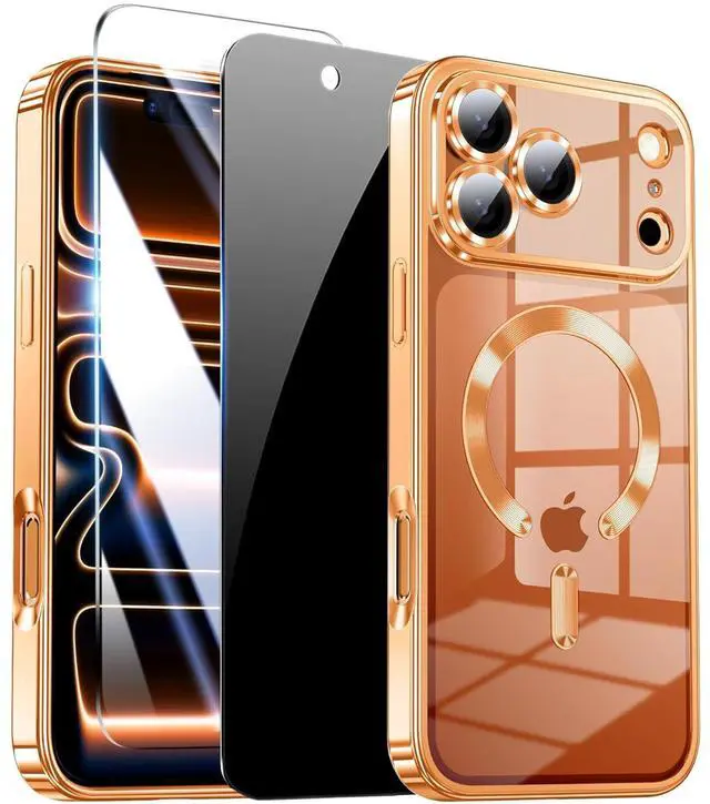 Glossy Luxury Magnetic for iPhone 17 Pro Max Case with 2 Screen Protector & Camera Protector,Compatible with MagSafe Slim Clear Military Grade Drop Protection Cover for iPhone 17 Pro Max-Orange