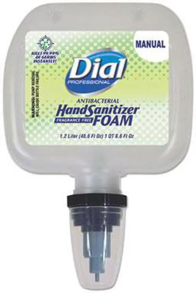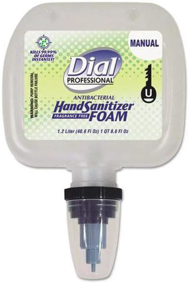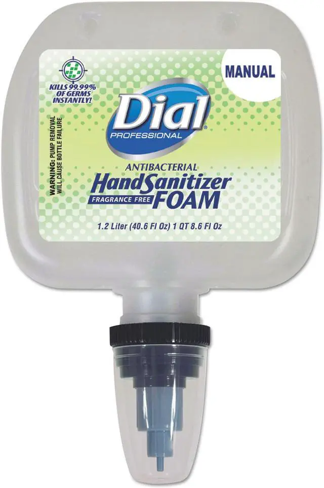 Kills 99.999% of bacteria without soap and water in as little as 15 seconds. Delivers 10x more moisturization to the skin than if left untreated. Provides clean, convenient, effective bacteria-kill, yet is gentle on hands. For Use with Dial Professional Duo Manual Dispenser. Hand Sanitizers Type: Foam; Color(s): Clear; For Use With: Dial Professional Duo Manual Dispenser; Volume Capacity: 1,200 mL.
