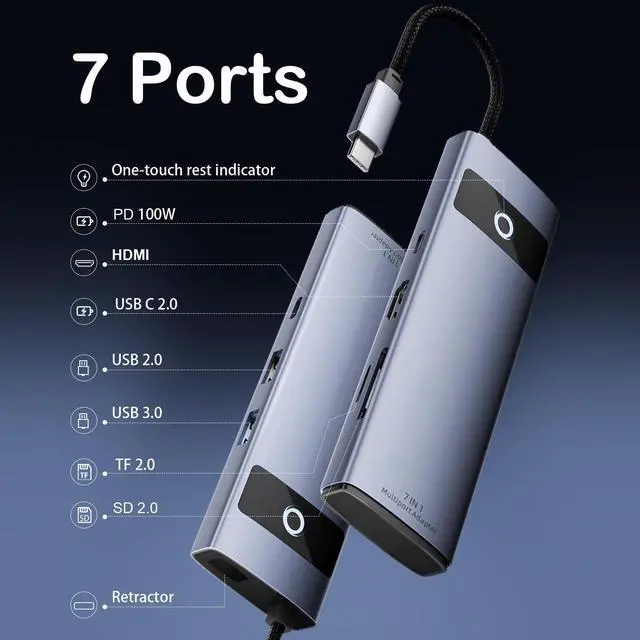 Transform your USB-C device into a productivity powerhouse with this versatile 7-in-1 docking station. This sleek, space gray hub expands your connectivity options with a 4K HDMI port supporting crystal-clear output, perfect for extending your display to a larger screen. The hub features three USB-A ports for connecting your favorite peripherals, while the integrated SD and TF card readers make transferring photos and files a breeze. With 100W Power Delivery pass-through charging, you can keep your device powered up while using all ports simultaneously. Compatible with a wide range of devices including iPhone 15, MacBooks, Windows laptops, Steam Deck, and ROG Ally, this compact adapter is an essential tool for modern computing. The durable braided cable and premium aluminum construction ensure reliable performance, while its portable design makes it perfect for both office and travel use.