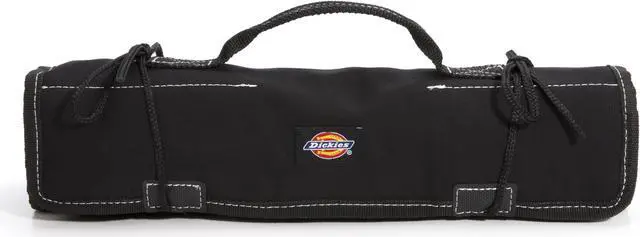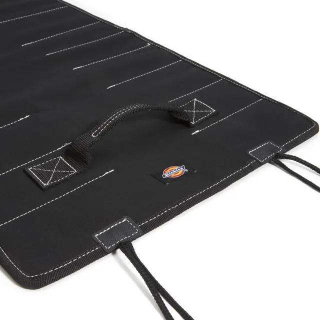 Expertly store your tools with the Dickies Work Gear 57060 Large Wrench / Tool Organizer Roll. This handy black fabric tool roll features 23 individual pockets that can hold your wrenches, ratchets, screwdrivers and any other hand tools you might have. Made of durable and rip-resistant cotton canvas it features fold-over protective flaps to keep your tools in place during transport between jobs, and with its convenient roll-up design, you can easily pick up and go. The reinforced drawstring ties keep the roll secured shut, and the webbed handle makes carrying a breeze.