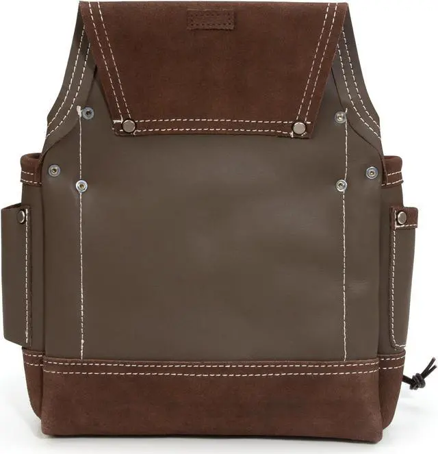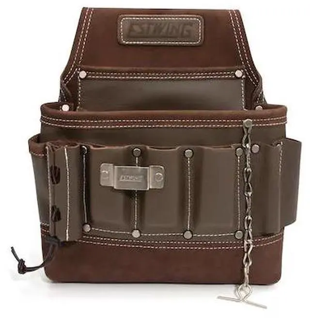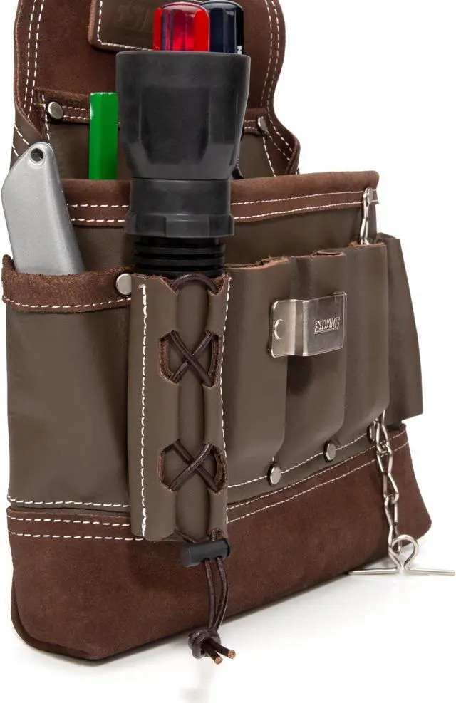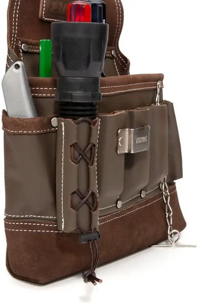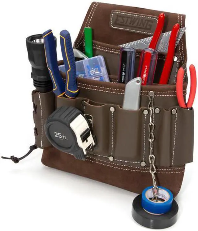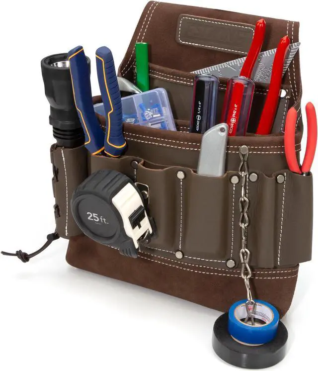 California Proposition 65: This product contains a chemical known to the State of California to cause birth defects or other reproductive harm. Designed for maximum utility and constructed for ultimate reliability this Estwing electrician's tool pouch has a single large main pocket that is lined with several smaller slip pockets to let you carry the tools and supplies you need to get your work done. Made from 100% top grain cowhide leather, this handy pouch supplies you with a total of 8 various sized pockets to store utility knives, wire cutters, screw and bit drivers, and other small tools and includes 3 wet molded pliers pockets that can adapt to snugly fit stored tools. Additional storage includes several exterior tool loops, an adjustable flashlight holder, steel tape measure clip, and a steel electrical tape chain. Rivet-reinforced stress points and pocket corners add extra support to the heavy-duty double-stitches binding edges to provide lifelong reliability. The integrated tunnel-style belt loop is wide enough to fit onto belts of up to 3-inches in width.