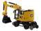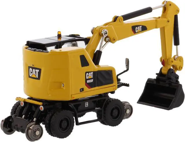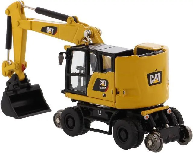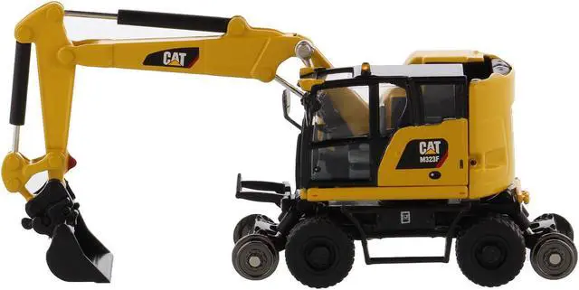 Brand new 1/87 (HO) scale diecast model of CAT Caterpillar M323F Railroad Wheeled Excavator with 3 Accessories (Safety Yellow Version) "High Line" Series die cast model by Diecast Masters.