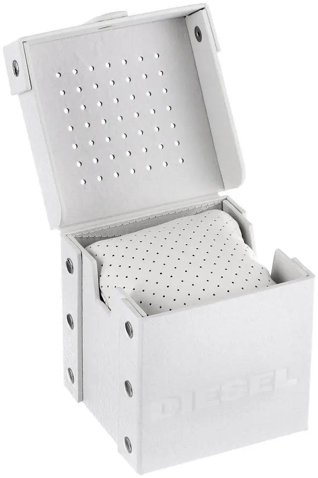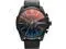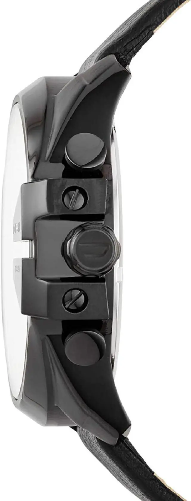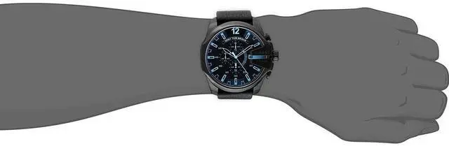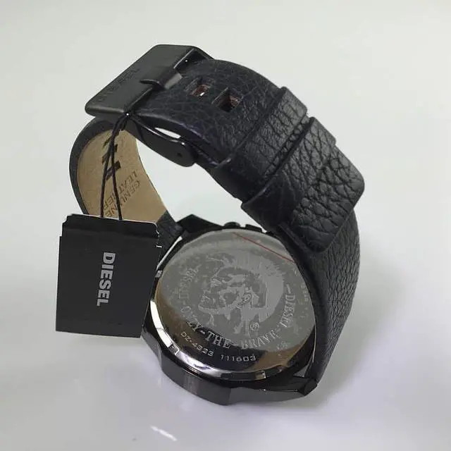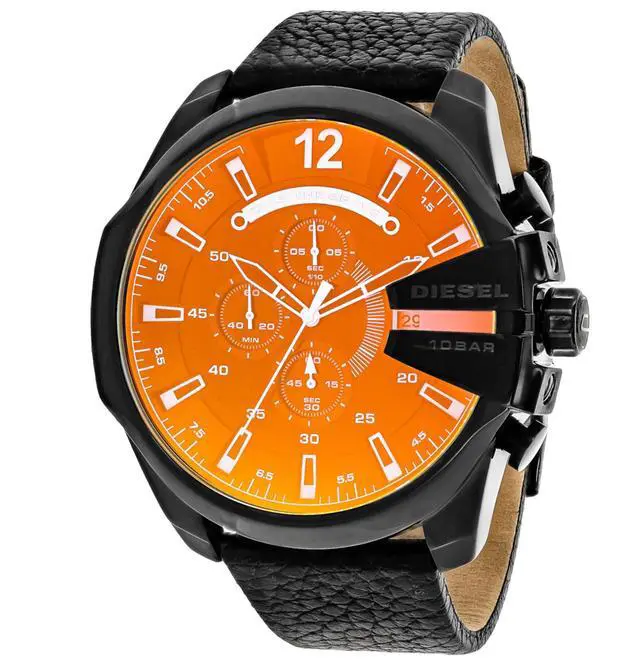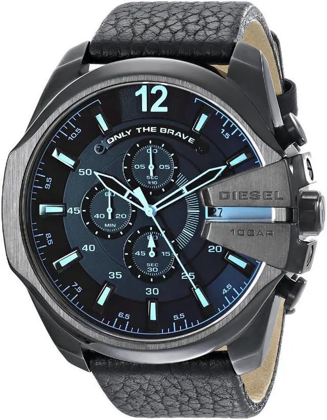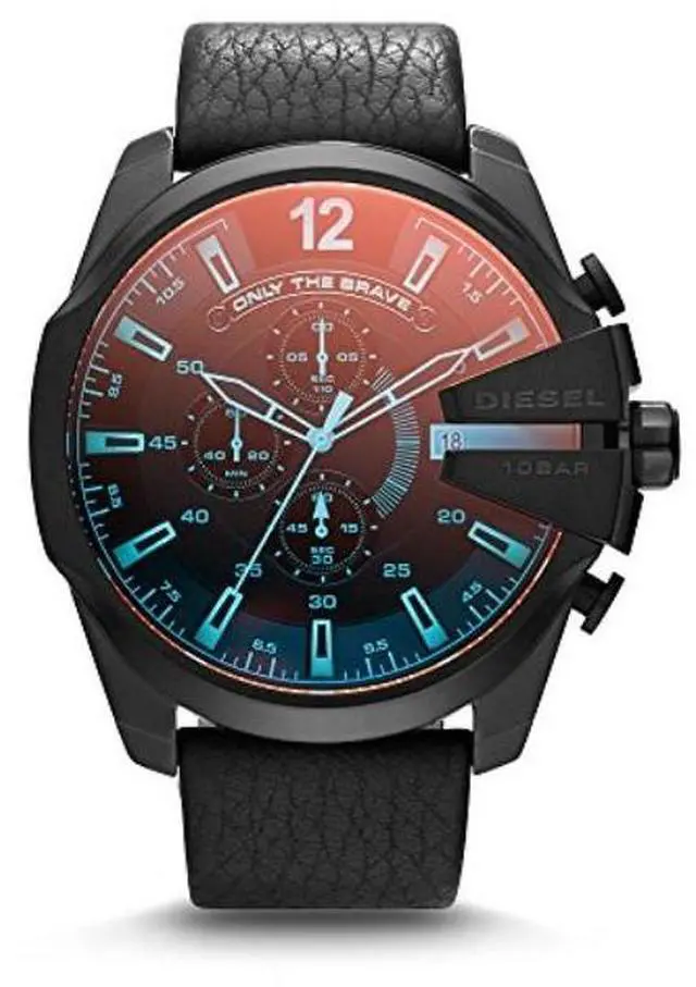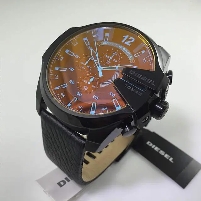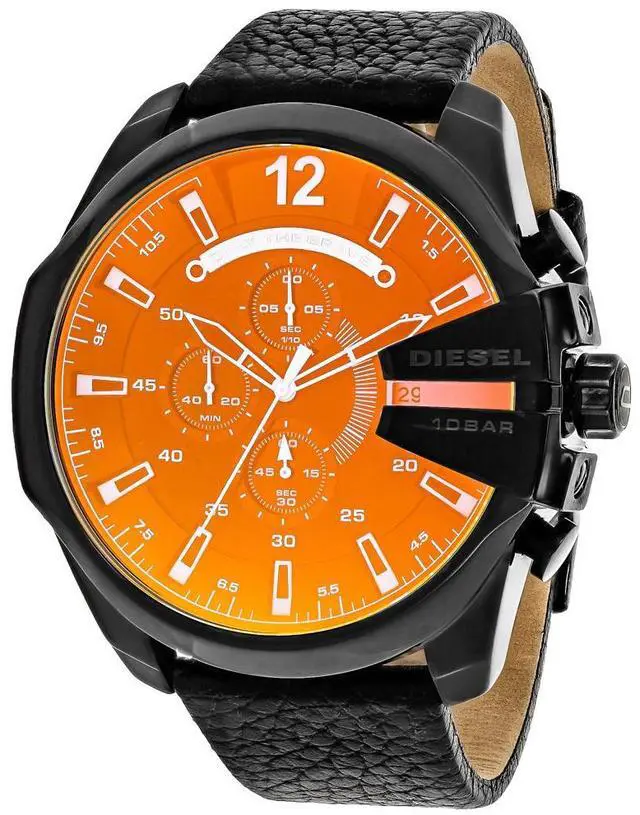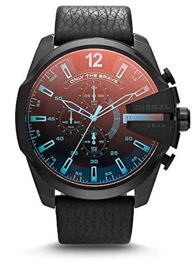 DZ4323 Retail Price: $ 240.00 Diesel Mega Chief Watch Collection. Black stainless steel case. Black genuine leather strap. Black iridescent dial. Date display. Chronograph Function. Luminous hands and hour markers. 3-hand quartz analog movement.