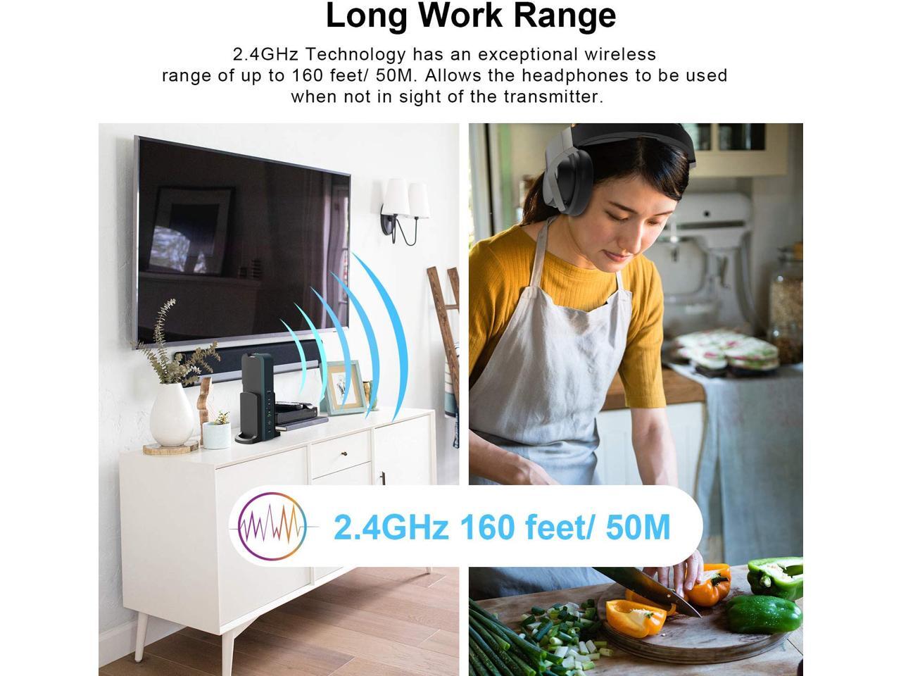 - 2.4GHz Technology: Has an exceptional wireless range of up to 160 feet/ 50M. The expanded reception range allows the headphones to be used when not in sight of the transmitter. The decoding revert the original real sounds.
