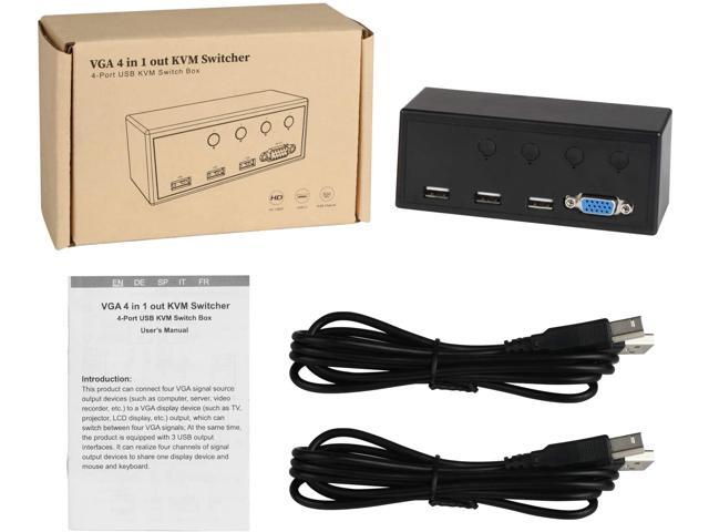 - Portable and Easy to Use: 3 USB Type A Output and 1 VGA Output , 4 USB Type B Input and 4 VGA Input . The 4 In 1 Out VGA KVM Switch between four computers is controlled by the push button on the top of the unit.