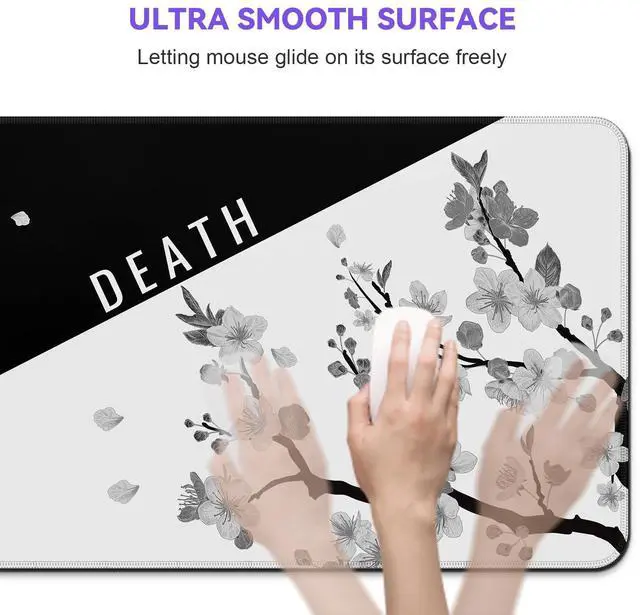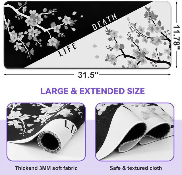 KEHIPI Mouse Pad Gaming Keyboard Pad 31.5 x 11.8 in Gaming Mouse Pad with Anti-Slip Rubber Base and Stitched Edges, Japanese Life Death Keyboard Mat(Black with White Cherry Blossom)