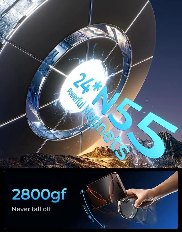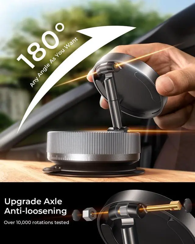 360° Swiveling and Dual Axis 180° Adjustment: This vacuum magnetic phone holder stand features a 360° swivel rotation shaft and a 180° dual axis folding metal arm that easily adjusts the angle to suit your needs. Effortlessly switch between portrait and landscape modes whether you're in the car or at the office. The unique folding design reduces the size of the stand by 60% when not in use, keeping your space tidy. After more than 3000 times of durability test, it is still stable and reliable for long-term use.