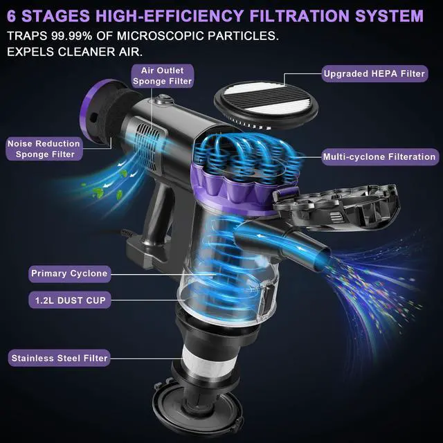 The bagless vacuum F800 features a 6-Stage Double-Cyclone Filtration System, ensuring a 99.99% removal of microscopic dust particles. With 9 cones preventing fine dust from blocking the HEPA filter, it maintains powerful suction and extends filter life for consistent high performance over time.
