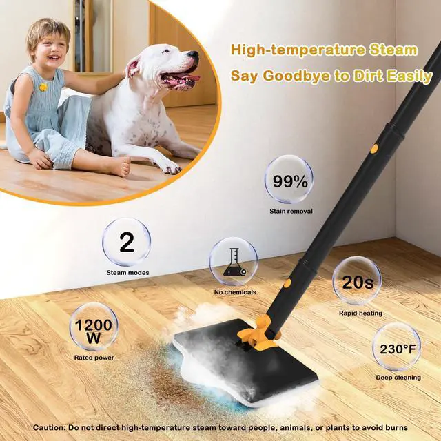 The steam mop features a 12oz tank for extended use and washable pads for eco-friendly convenience. It cleans and dries floors quickly, leaving no wet mess behind—just a sanitized, ready-to-use surface.