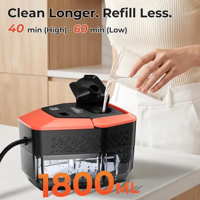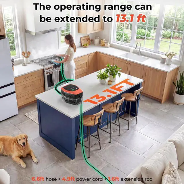 ? Extended Use: The 1.9 Quart tank minimizes refills (Min gear: 60 mins | Max gear: 30 mins), while the 13.1 ft operational range (6.56 ft hose + 4.92 ft cord+1.6 ft extension rod) ensures mobility.