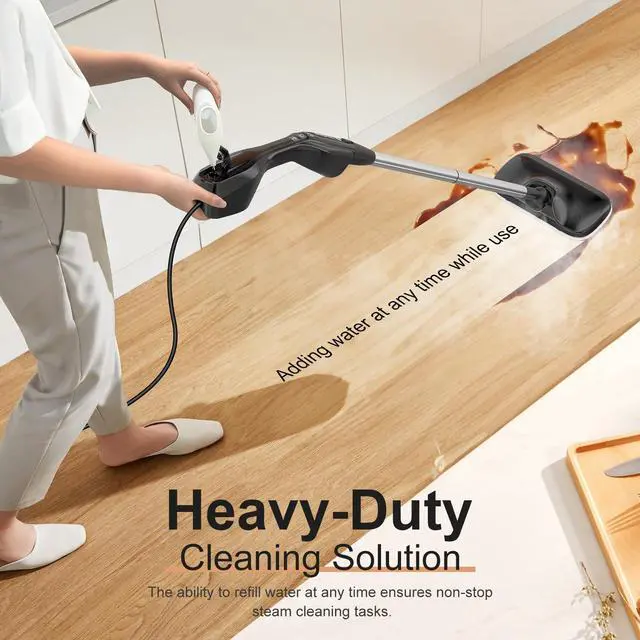 The Floor Steamer is easy and convenient to refill water at any time No-disassembly. Use only pure water Chemical-free to keeps children & pets safe.