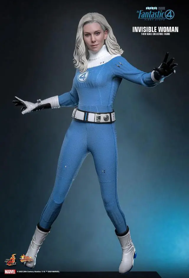 Hot Toys is proud to present the 1/6th scale Invisible Woman Collectible Figure. The figure features a newly developed head with rolling eyeballs and meticulously sculpted icy-blonde hair to reflect Vanessa Kirbys likeness. She is dressed in her retro-futuristic Fantastic Four uniform with a coordinating belt and boots. The figure offers nine pieces of both gloved and ungloved interchangeable hands, allowing collectors to showcase her in relaxed stances or ability-using poses. Accessories include a translucent holographic force-field effect to recreate her energy shields, a baby Franklin Richards with slightly articulated limbs and nestled in a cradle covered by a removable lid, and a specially designed figure stand. A Special Edition only available in selected markets will include a specially designed