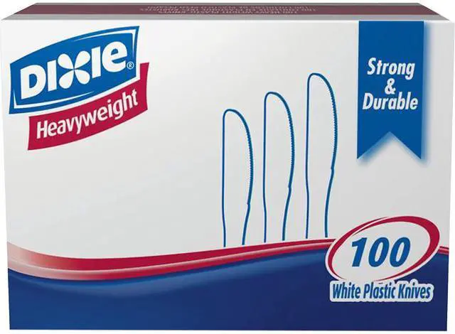 Heavyweight cutlery is the next best thing to silverware. Spend less time cleaning and more time getting work done by choosing Dixie heavyweight utensils. No matter what your meal entails, these heavyweight utensils are up to the task. Offers full-size dinner length and strong, shatter-resistant and durable construction. Ideal for heavy, tough-to-cut food like steak and chicken. Dixie plastic utensils are ideal for office parties, luncheons and breakroom use. Coordinates with any table setting. Get the heavyweight utensils you need, including these knives in white. Dixie heavyweight knives are flexible, yet rigid. White knives come in a box of 100.