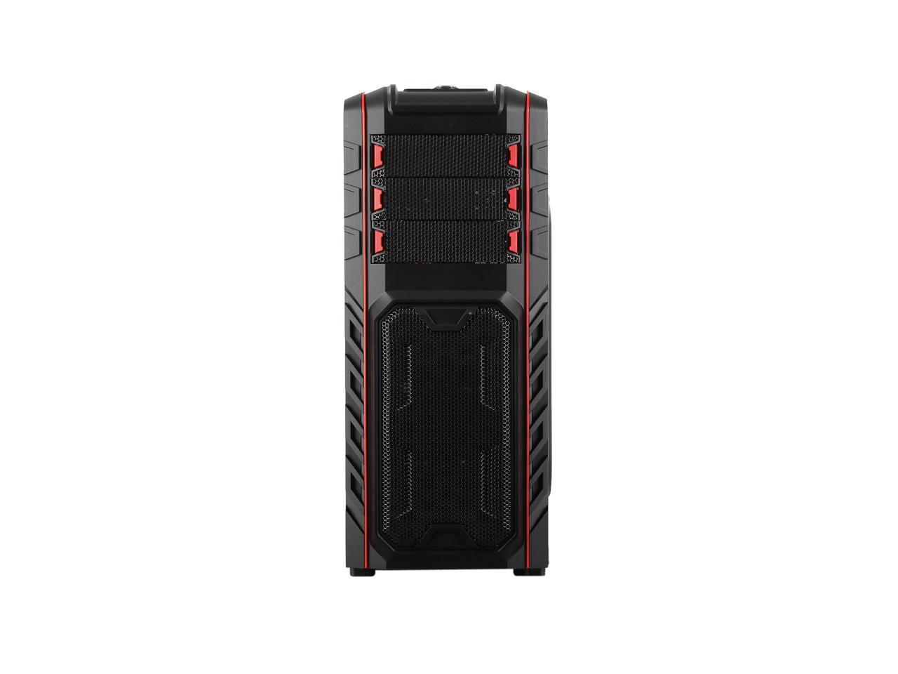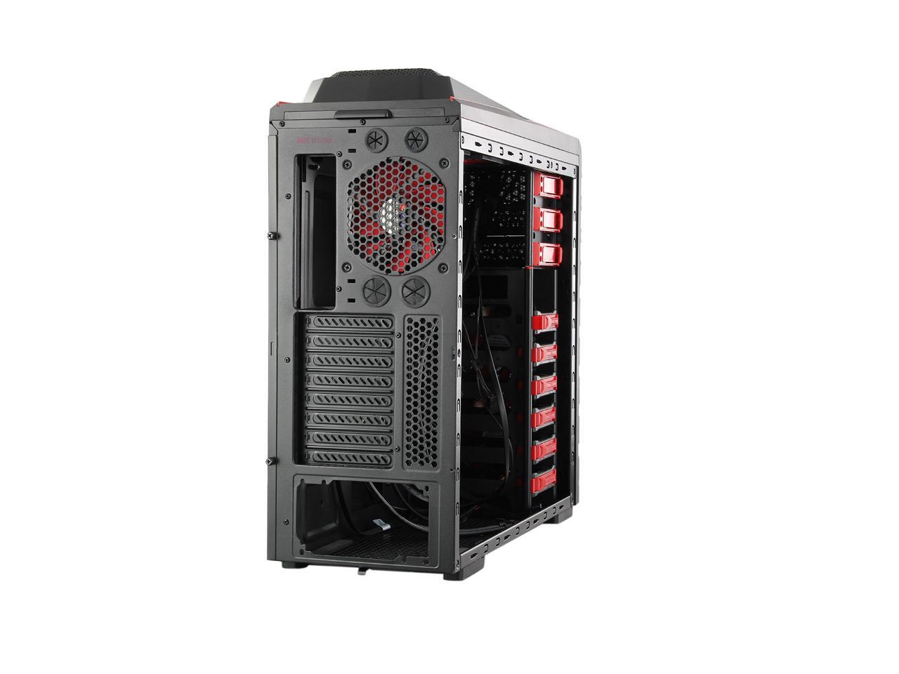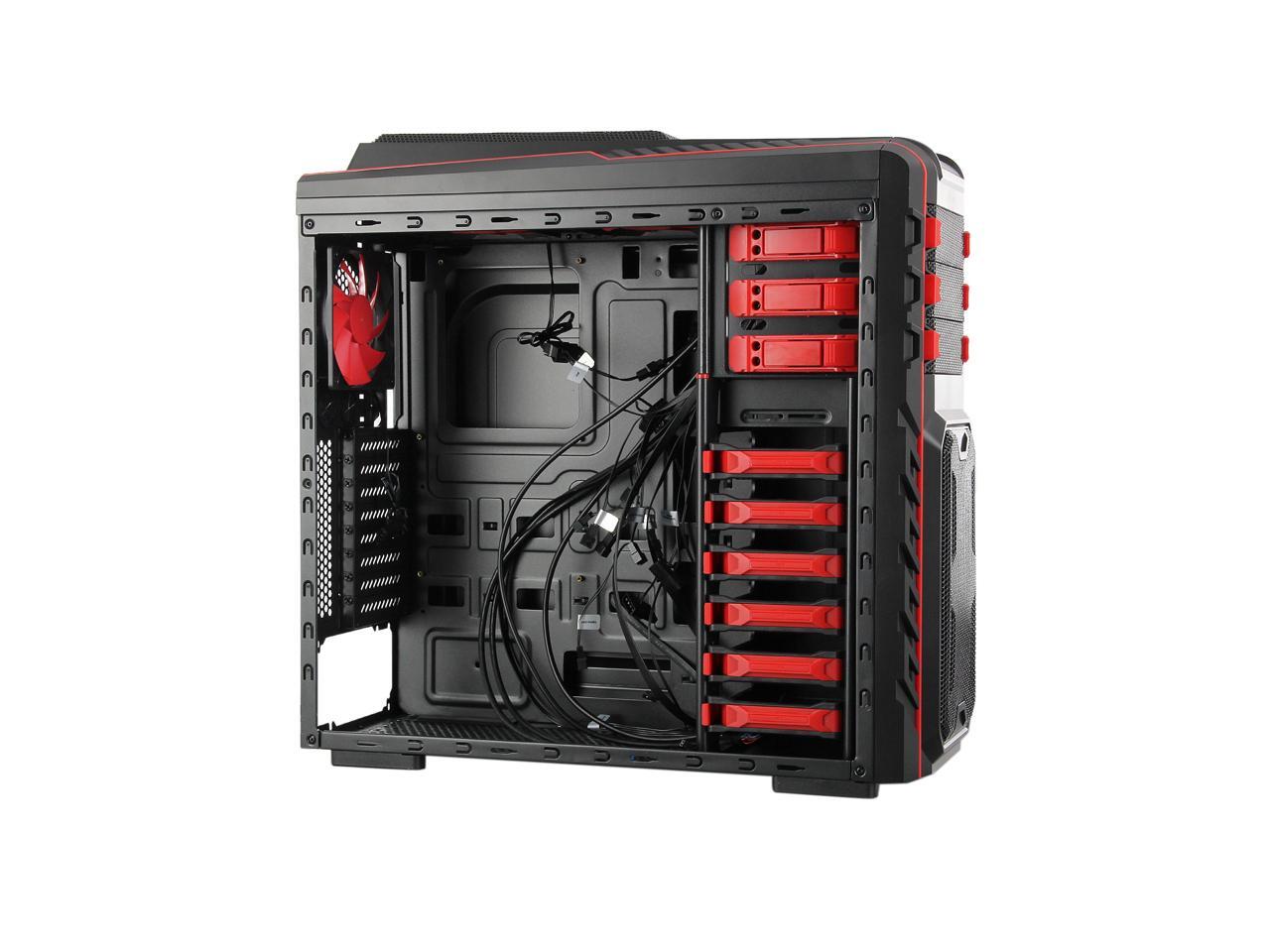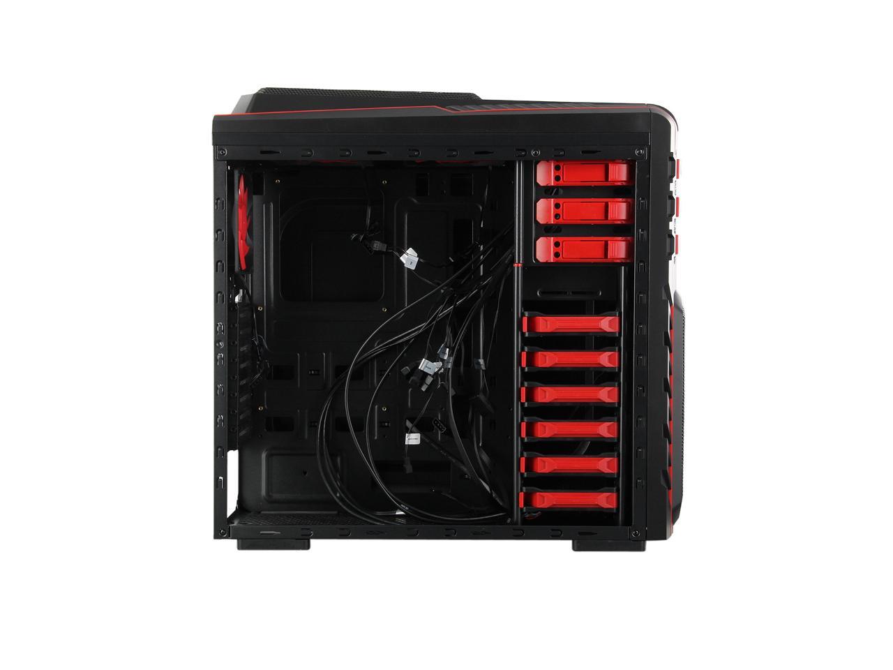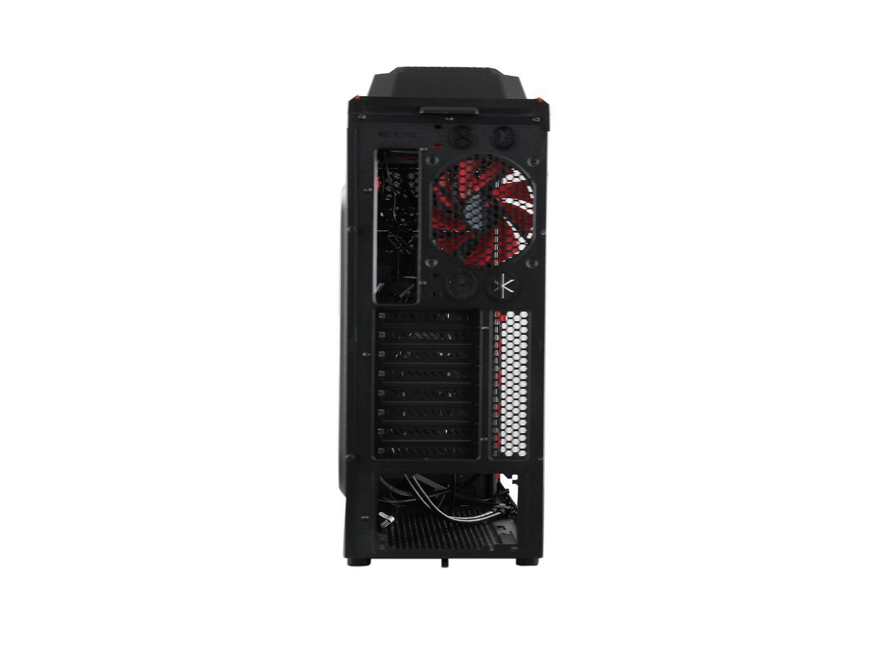 Two front 120mm LED red fans, two top 120mm red fans, two side 120mm LED red fans and one rear 120mm red fan work together to create cyclonic airflow that takes the heat away and helps keep your system running stable and always at peak performance. The glowing LEDs give out eye-catching light that liven up every gaming session.